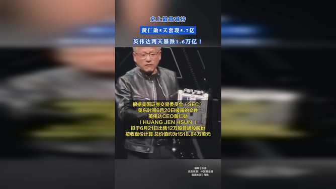 钛媒体App6月22日消息,近两个交易日,英伟达回调6.7%,市值蒸发2220亿美元,折合人民币1.60万亿元。根据美国证券交易委员会(SEC)美东时间6月20日披露的文件,史上最贵减持:黄仁勋天套现亿,英伟达两天暴跌万亿英伟达CEO黄仁勋(HUANGJENHSUN)拟于6月21日出售12万股普通股股份,按收盘价计算,总价值约为1518.84万美元。连同6月21日的减持,黄仁勋自6月13日起至今,在5个交易日内,合共已减持公司股份60万股,套现超7900万美元,折合人民币超5.7亿元。(中国基金报)